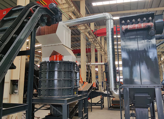 破碎線主機殼體采用特厚鋼板制造,內襯為高錳鑄鋼件,可更換;主機轉子盤安裝于水平軸上,轉子盤圓周分布有銷軸,軸向懸有錘頭;主軸用滾珠軸承支撐,循環(huán)油強制潤滑冷卻,并裝有溫度傳感器;進料口裝有液壓輥筒喂料裝置,位置一高一低,同向旋轉,能將大件松散物料壓扁,送入破碎腔內。